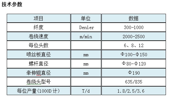 丙綸高強FDY紡牽聯(lián)合機主要特點 1.螺桿為加長型,變頻及壓力調節(jié)儀器為進口品牌。 2.采用了新型高效節(jié)能型紡絲箱體,比普通紡絲箱節(jié)能。 3.采用上裝式組件,方便紡絲工操作。 4.側吹風系統(tǒng),風速均勻穩(wěn)定,纖維條干好。 5.采用感應或高頻加熱牽伸輥輥,降低能耗。 6.多種組合的多級牽伸和熱定型方式可滿足丙綸牽絲不同性能的要求,紡絲強度大于7g/d。 7.采用全自動卷繞頭,切換成功率高、廢絲率低、成形良好。 8.溫控儀表、變頻器為進口品牌。
